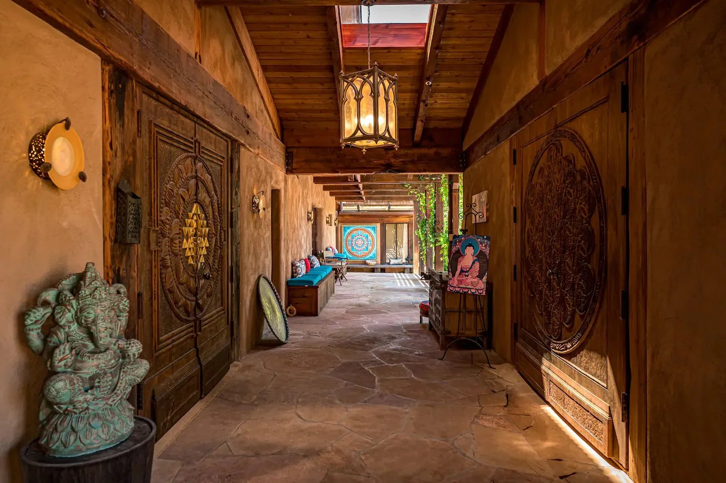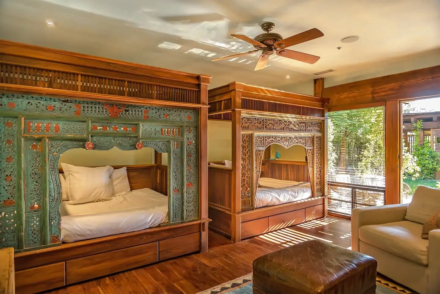 These two intricately handmade wooden beds create a special oasis as well as bring the essence of India to life. This room is also the coolest in the house during the hot summer months. It also provides direct access to the community courtyard with its own private entrance.
