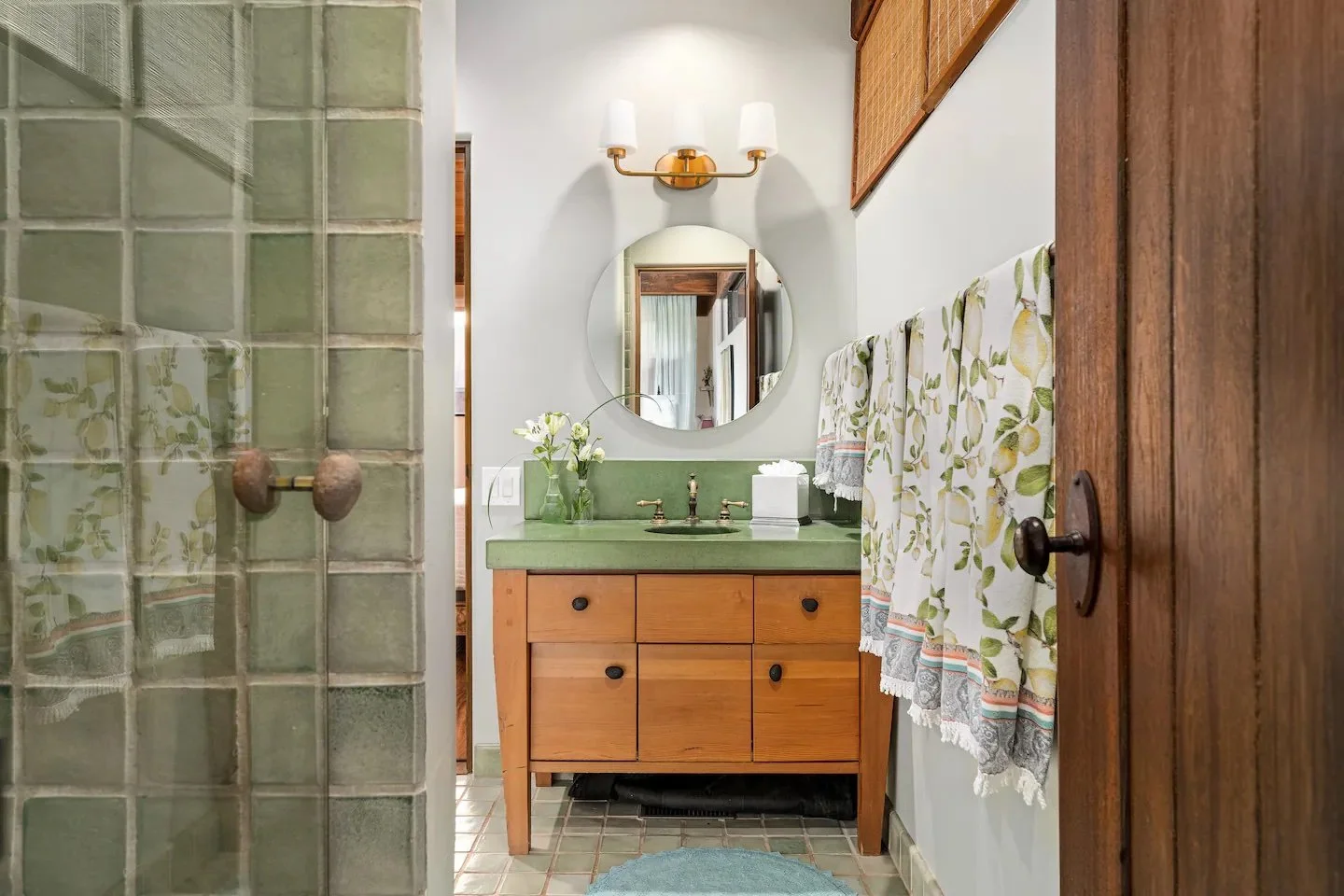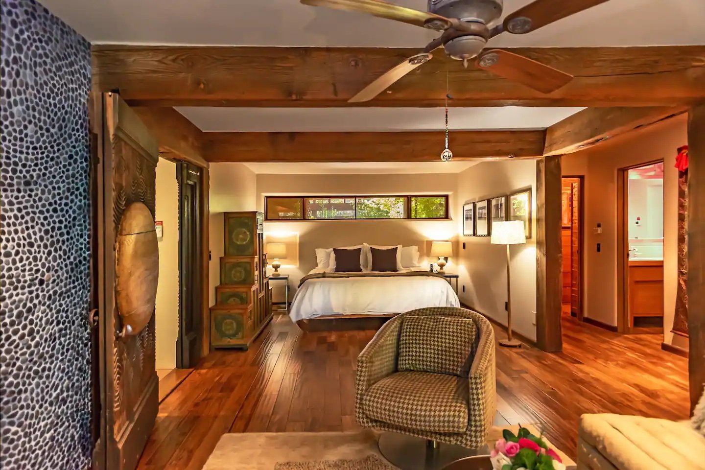 The Primary Suite is an extraordinary and completely private oasis equipped with a California King-sized bed, a full sitting area with a stunningly beautiful rock fireplace, an enormous walk-in closet and full newly remodeled bathroom handcrafted in local stone. The seating area opens out to the Maple Tree Garden where you’ll find a hanging bed to cozy up to or walk out to the outdoor dining area and pool.