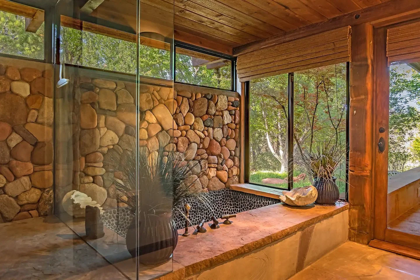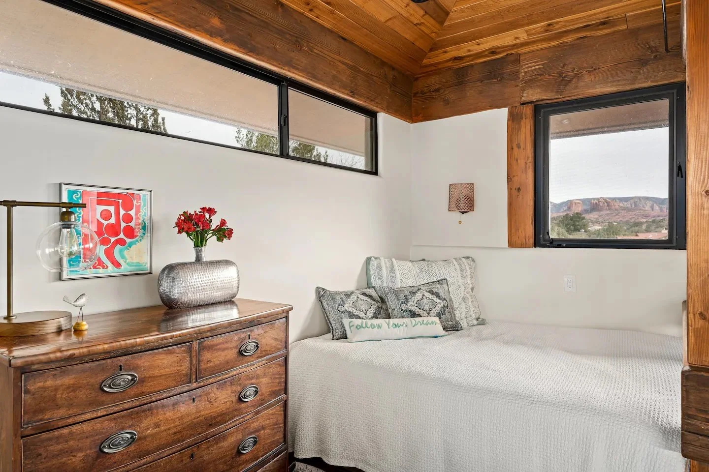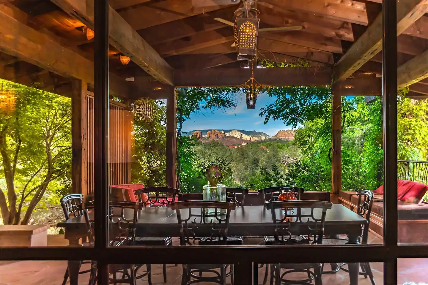 Summit the uniquely hand carved teak staircase for the most stunning views of the majestic Red Rock Mountains from the Library Loft. This is a special area perched above the main living room and overlooking Cathedral Rock and Thunder Mountain.